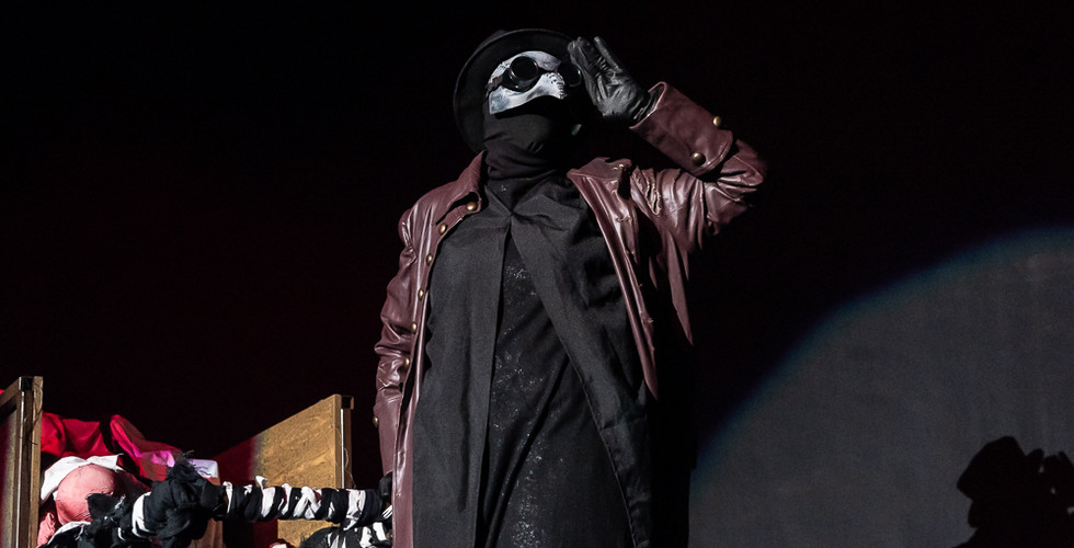 A plague masked figure calls out to "Bring out your dead!" in advance of Megadeth's set